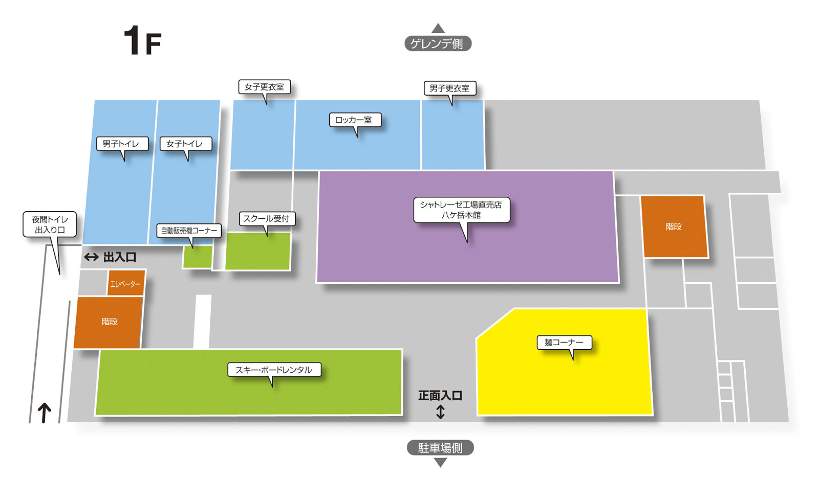 ![]() リフト券の販売は平日はインフォメーション、 土日祝はゲレンデ前のチケット売り場となります ![]() ゲレンデが一望できるテラスでの休憩もおすすめ ![]() 土日祝日はレンタルスキー板の引渡しが 2階テラスから入口となります |